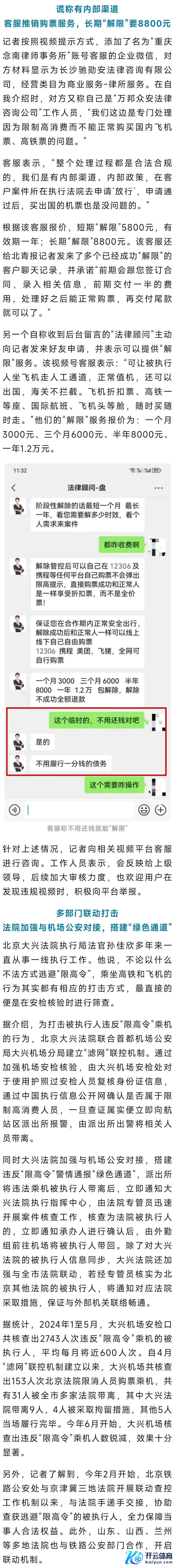 近日,记者发现短视频平台频出“限高令新政”的关连视频,称“有里面道路,被死一火高挥霍东说念主员无须还款也能平素买机票、高铁票。”视频发布者中,不乏有被认证为律所及法律斟酌公司的账号。记者访问发现,这些所谓的“职责主说念主员”巨额套用了两三层不同身份,打着普法视频的幌子,向被限高的被施行东说念主宣传自家的买票就业。尽管每条视频发布几个小时后便会删除开云体育,但下方评述仍有近百东说念主留言斟酌。