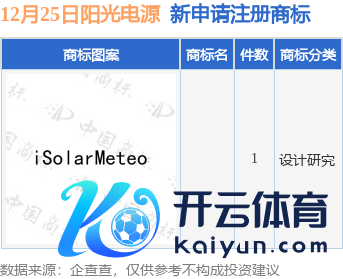 本站音讯,凭据企查查数据披露,近日阳光电源股份有限公司新提交1件商标注册请求。商标请求细则如下: