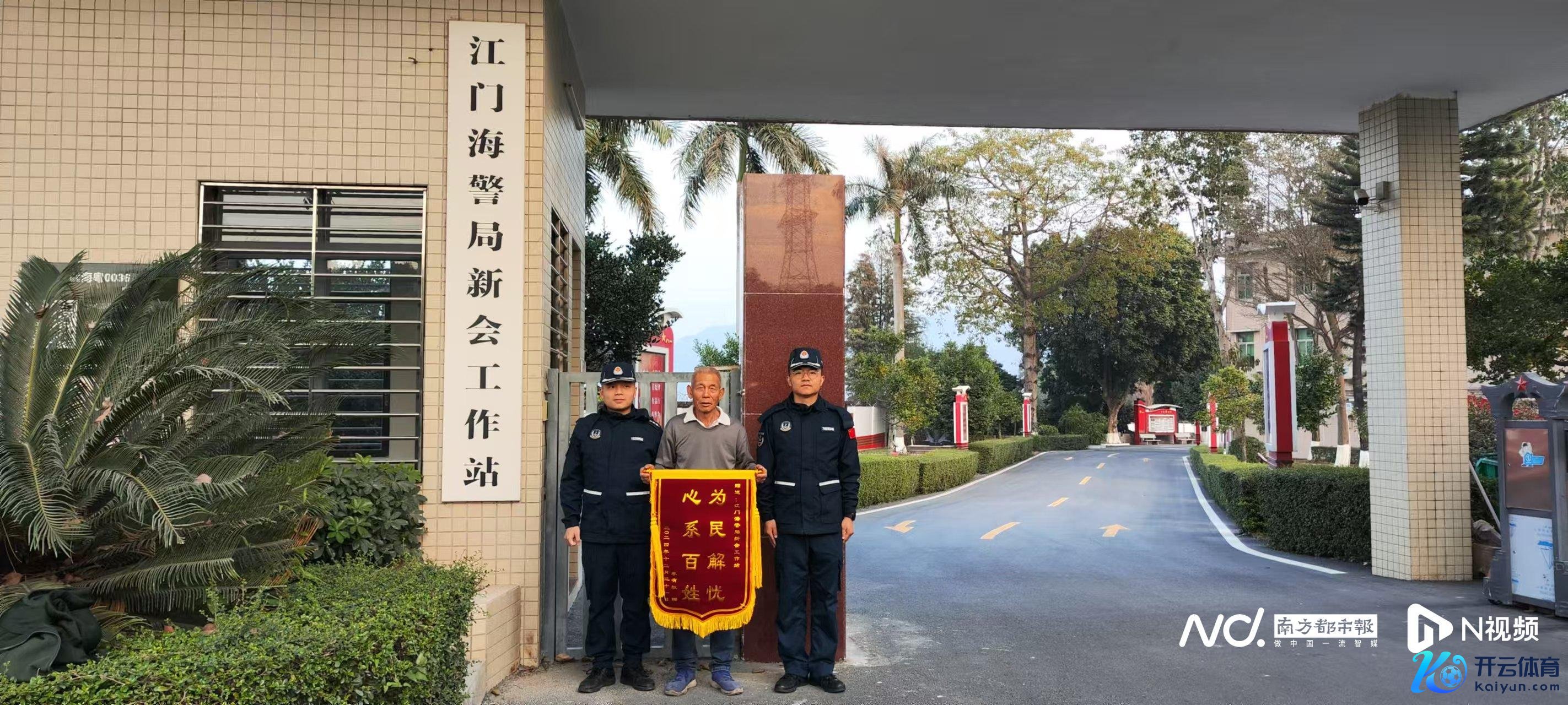 南王人讯 记者罗忠明 通信员舒湘渝 张晓山 近日,江门一位渔民来到江门海警局新会职责站,向海警功令员扶持锦旗示意感谢。