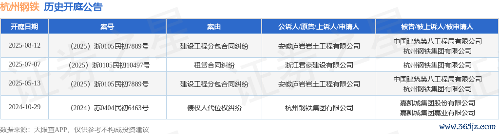 案号:(2025)浙0105民初7889号审理法院:杭州市拱墅区东说念主民法院案由:竖立工程分包协议纠纷当事东说念主信息: 原告/上诉东说念主:安徽庐岩岩土工程有限公司 被告/被上诉东说念主:中国建筑第八工程局有限公司、杭州钢铁集团有限公司开庭日历:2025年8月12日字据统计,近一年内以杭州钢铁集团有限公司为当事东说念主的历史开庭公告有4则,其中案由为“竖立工程分包协议纠纷”的公告以2则居首,其次为“债权东说念主代位权纠纷”有1则,“租出协议纠纷”有1则。历史开庭公告如下: