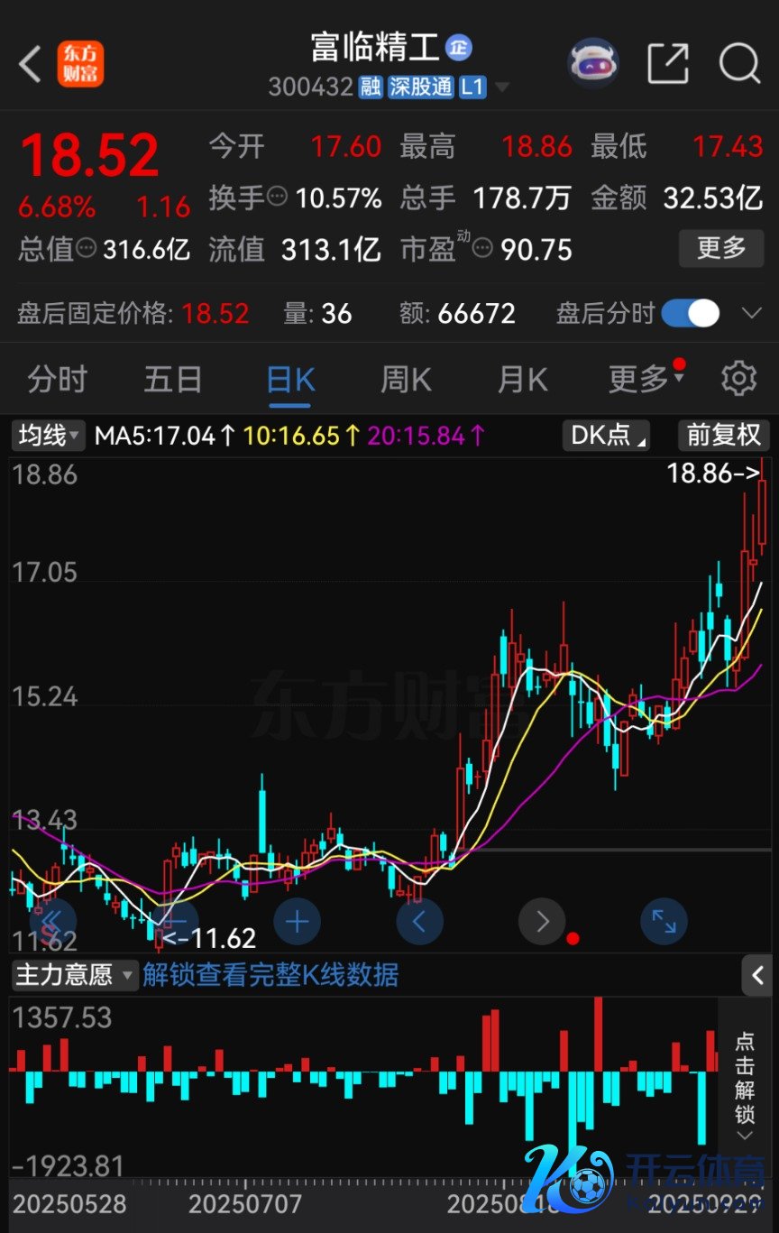 斥逐9月29日收盘,富临精工股价报18.52元/股,涨幅达6.68%,总市值为316.6亿元。