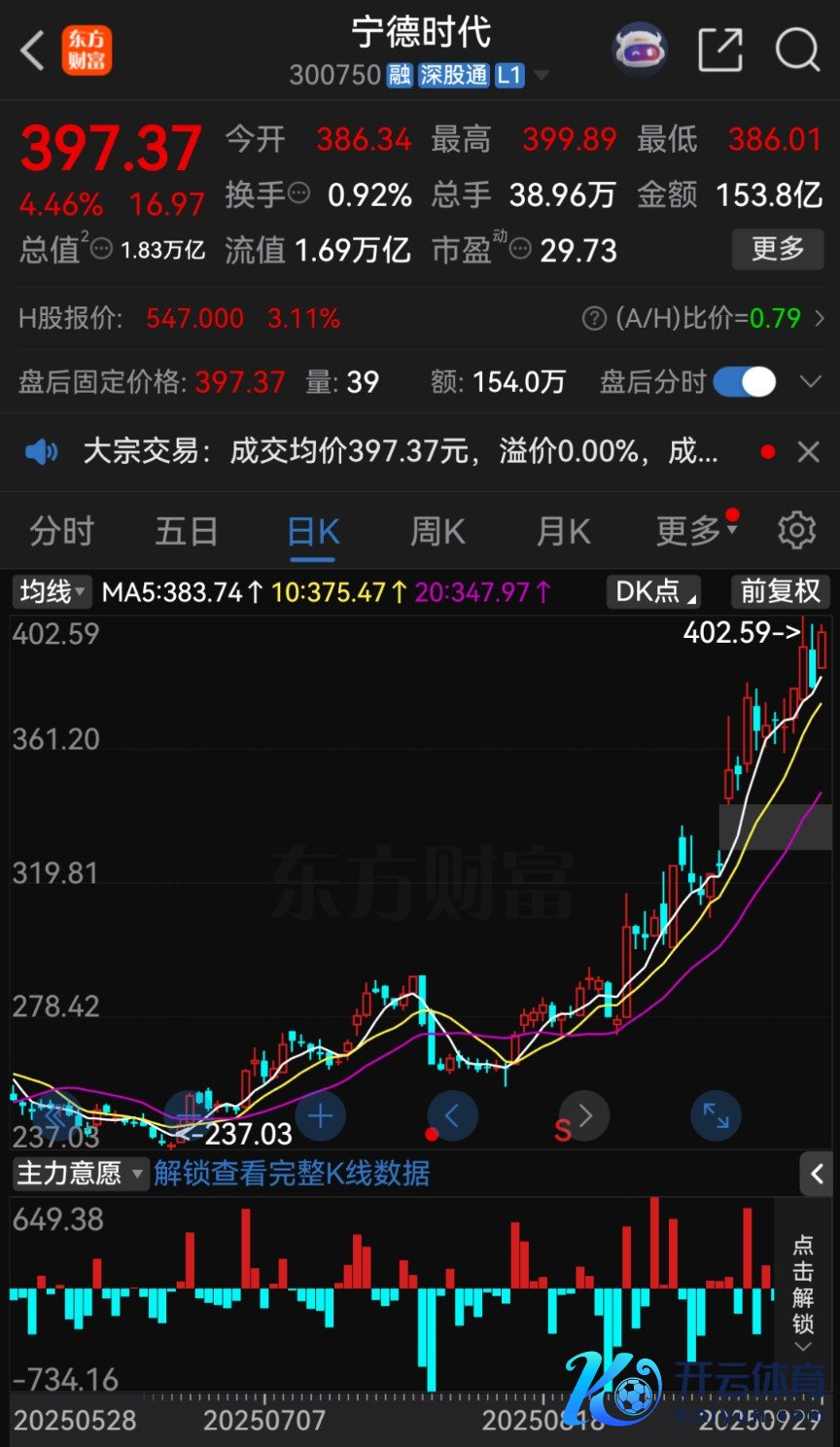 斥逐9月29日收盘,宁德期间A股股价报397.37元/股,涨幅达4.46%,总市值为1.83万亿元。