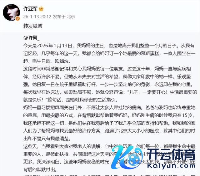 时辰赶紧,直到2026年1月13日,何晴物化一经整整一个月了,许亚军才终于表态,让一切尘埃落定。