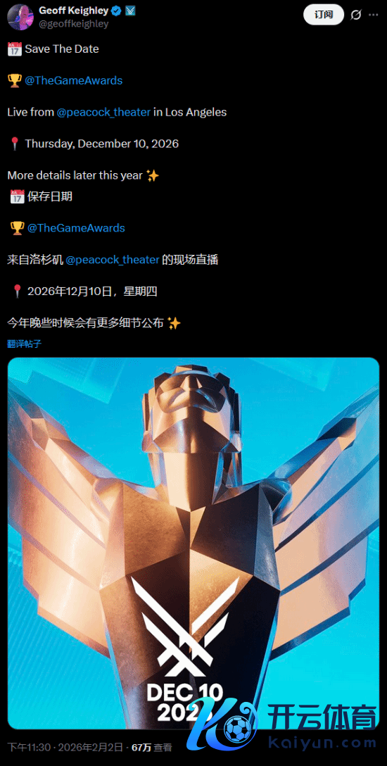据Gamingbolt报说念,诚然2026年才刚刚往时一个月,但TGA主持东说念主Geoff Keighley就还是敲定了本年TGA的举办技巧——12月10日,在洛杉矶孔雀剧院进行人人直播。不外商量到中好意思两地之间的时差,这一技巧或者是北京技巧12月11日上昼。
