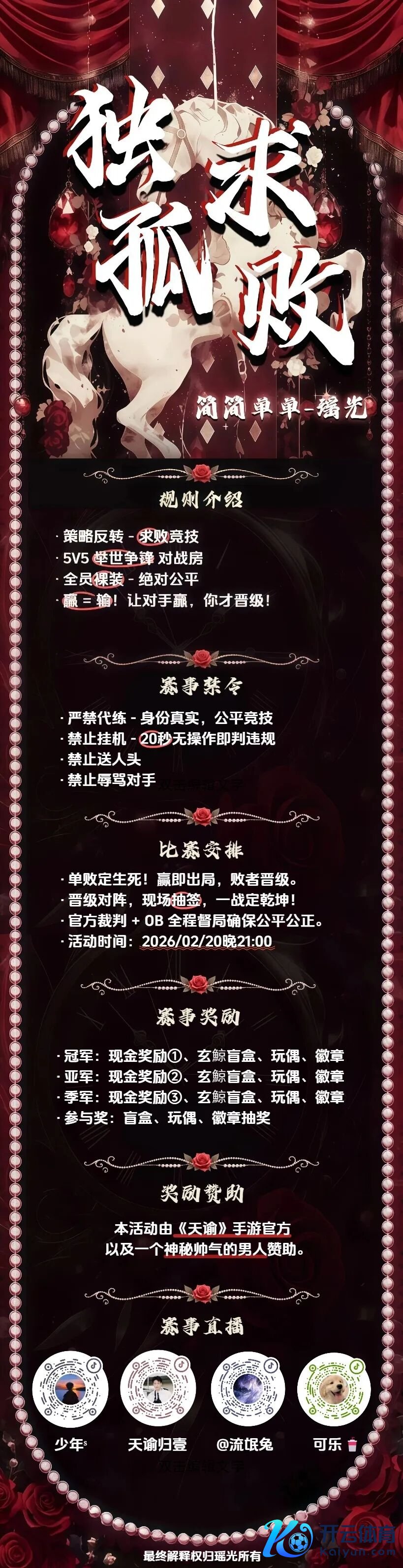 2月20日晚21点,【简通俗单】·瑶光公会的求败竞技场将迎来一场颠覆知识的5v5公正赛。规章只消一条:赢三场即淘汰,输满三场才调晋级。